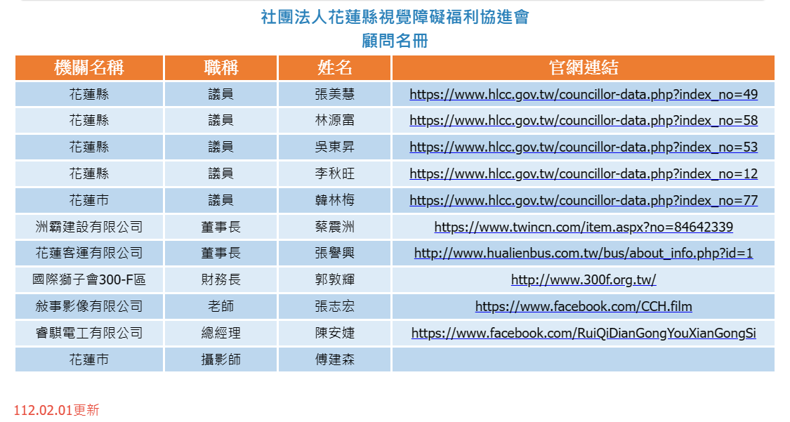 社團法人花蓮縣視覺障礙福利協進會 顧問名冊